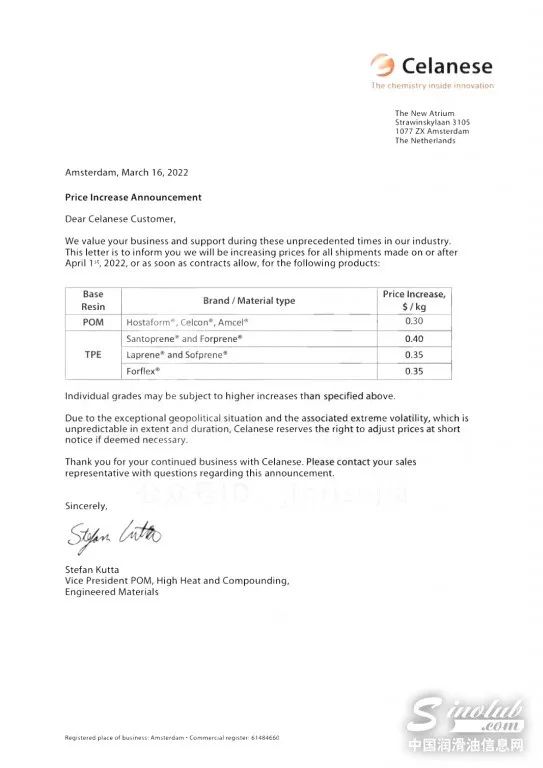 3月16日,塞拉尼斯發(fā)布調(diào)價通知函稱,將從4月1日起,提高公司部分系列POM(聚甲醛)、TPE(熱塑性彈性體)價格,最高漲幅高達400美元/噸!
