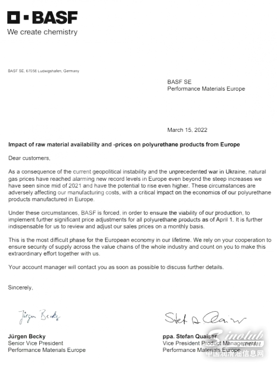 3月15日,巴斯夫發(fā)布客戶溝通函,將從4月1日起,對歐洲市場所有聚氨酯產(chǎn)品實施進一步價格調(diào)整。