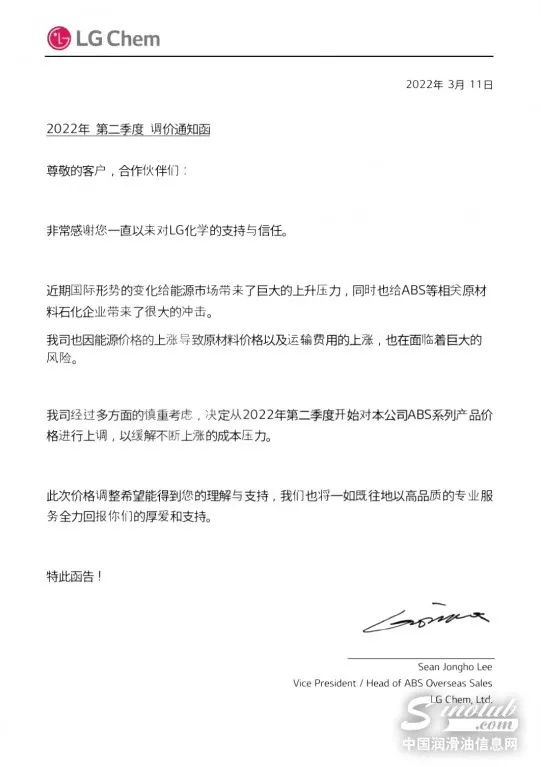 LG化學調(diào)價通知函稱,受國際形勢及能源上漲影響,自第二季度開始,公司將針對ABS系列產(chǎn)品進行提價!