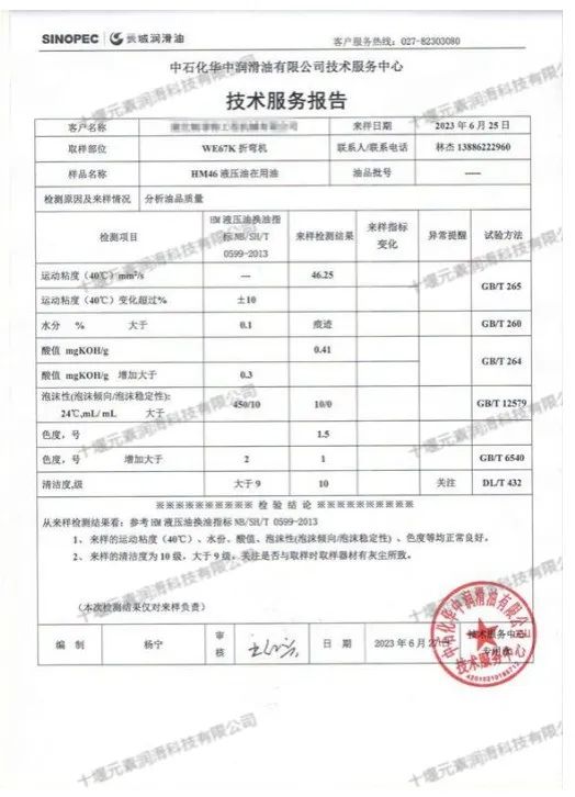 果不其然,6月27日《技術(shù)服務(wù)報(bào)告》出來(lái)后,對(duì)比NB/SH/T 0599-2013 L-HM《液壓油換油標(biāo)準(zhǔn)》,顯示該在用油的運(yùn)動(dòng)粘度、水分、酸值、泡沫傾向性正常良好,唯一清潔度超標(biāo)了1級(jí)(為NAS10級(jí)),分析判斷可能是抽取油樣過(guò)程中的污染所致,并不影響油品質(zhì)量,能滿足此設(shè)備繼續(xù)使用要求。