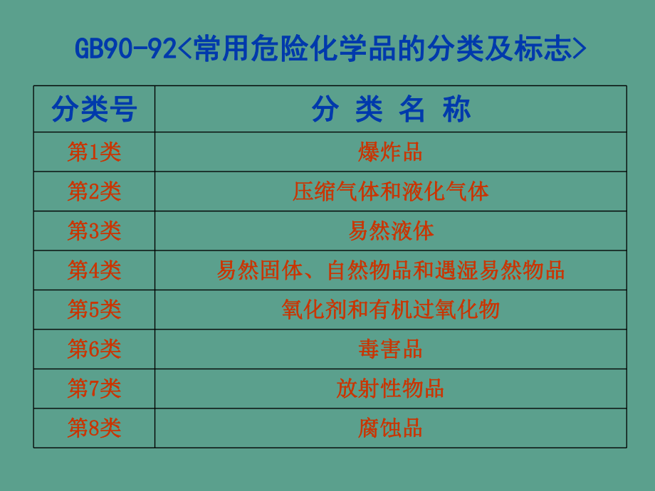 常用危險(xiǎn)化學(xué)品在《常用危險(xiǎn)化學(xué)品的分類及標(biāo)志(GB 13690-92)》中按危險(xiǎn)特性分為8類:(順序和危險(xiǎn)等級(jí)沒有關(guān)系)