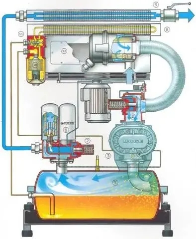 1.進(jìn)氣過(guò)濾器 2.多功能進(jìn)氣控制閥 3.注油管路 4.壓縮機(jī)機(jī)頭\轉(zhuǎn)子室 5.油氣預(yù)分離器罐 6.精細(xì)油氣分離器 7.最小壓力止回閥 8.油冷卻器 9.壓縮空氣冷卻器 10.油過(guò)濾器 11.溫控閥 12.清潔口