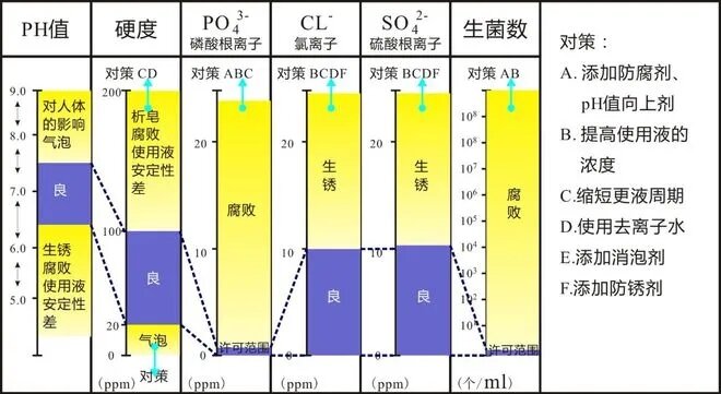 當(dāng)pH值<8.5時(shí),同時(shí)切削液還有異味,這時(shí)需要立即進(jìn)行殺菌處理,查明原因并制定合理的解決方案。